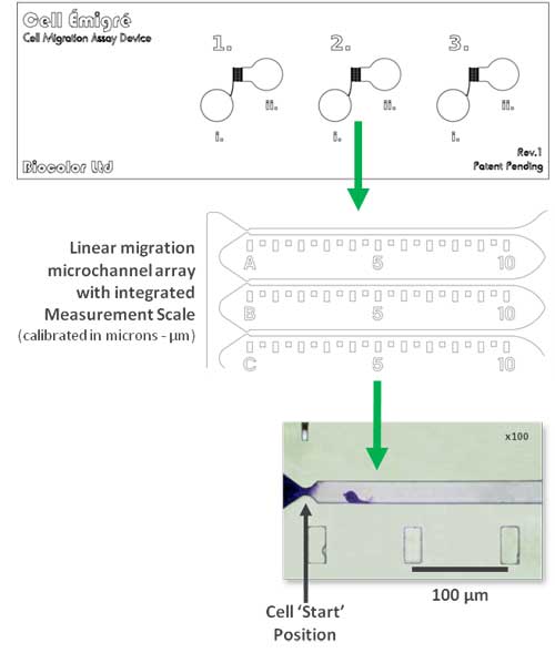 Each microchannel in the array contains a parallel measurement scale calibrated in microns. Cell migration can be rapidly & easily quantified (to the nearest 50μm) by visually comparing the alignment of a cell within the microchannel with this integrated measurement scale (using x40-x100 microscopic examination). Migration can be quantified at any time point during an assay.