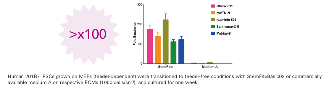 Under feeder-free culture conditions. StemFit®Basic02, Basic03, and Basic04 are capable:
