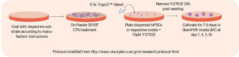 Feeder-dependent 201B7 iPSCs were transitioned to feeder-free conditions using respective cell adhesion substrates and seeded in StemFit®.