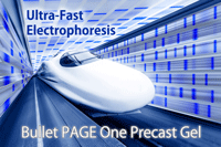 Bullet PAGE One Precast Gel can produce an excellent separation image with the shortest electrophoresis.Product Name Bullet PAGE One Company A Company B Gel % 5 - 15% 4 - 15% 4 - 12% Product No. 13079-84 - - Electrophoresis Time 11 min. 33 min. 50 min. Electrophoresis