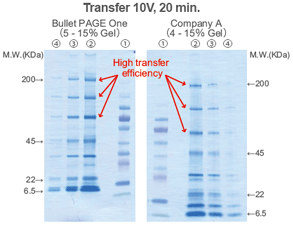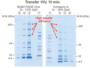 Bullet PAGE One Precast Gel indicates obviously higher protein transfer efficiency than company A’s, even though blotting time was only 10 min.