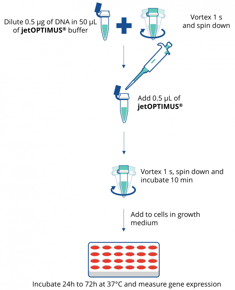 Fig. 3: Simplicity of the jetOPTIMUS® protocol for DNA transfection, here in 24-well plates.