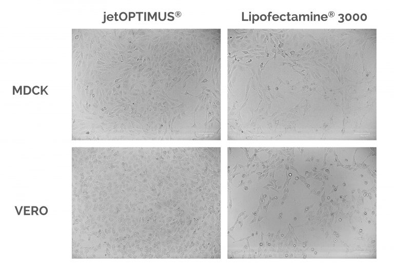 Fig. 2: Cells remains healthy and keep a good morphology 24h after transfection. Phase contrast microscopy of both MDCK and VERO cells 24 h after transfections with a plasmid coding for a GFP protein performed according to the manufacturer’s recommendations for each reagent.