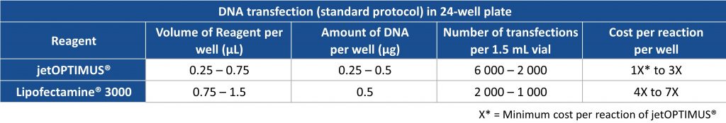 jetOPTIMUS® has been developed to increase transfection efficiency into a wide range of cell types, while keeping the amount of DNA as low as possible, and reducing the volume of reagent required compared to main competitors. Consequently, scientists can increase the number of transfections and reduce the cost per reaction by up to seven-fold (table 1).
