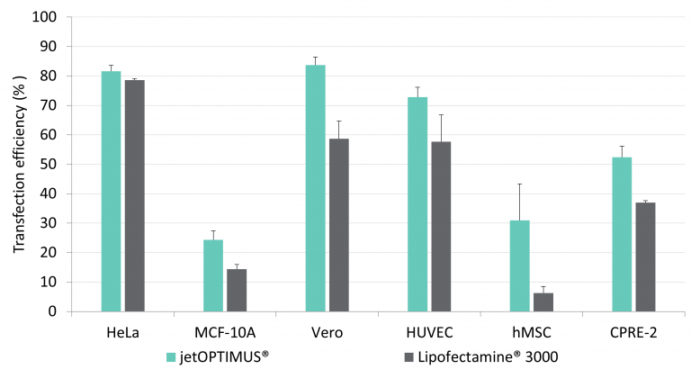 Fig. 1: jetOPTIMUS® outperforms its main competitor. Transfection efficiency was assessed by FACS analysis in various cell lines 24 h after transfection with a plasmid coding for a GFP protein in 24-well plates. Conditions were set up according to the manufacturer’s recommendations both for Lipofectamine® 3000 and for jetOPTIMUS®.