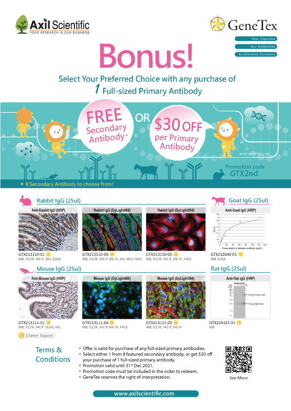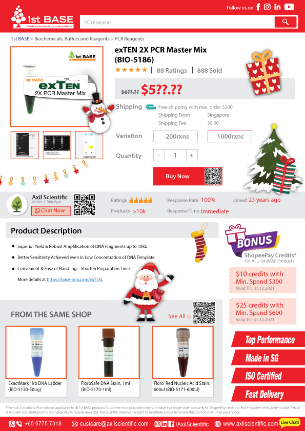 *Terms & Conditions. Promotion is applicable to all 1st BASE products. Customer must purchase minimum value in a single order to qualify for ShopeePay credits or Axil e-voucher of equivalent value. Please check with your institution for your eligibility to receive reward(s). Axil Scientific reserves the right to substitute and/or terminate this promotion without prior notice.