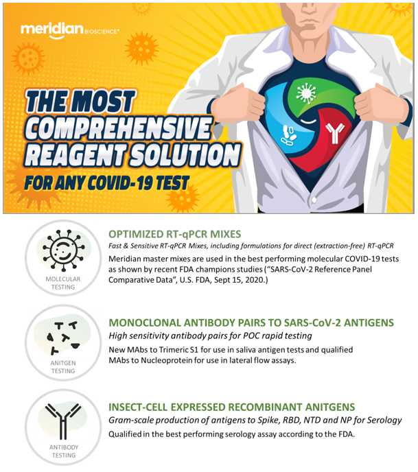 Meridian offers a range of COVID-19 testing solutions for both molecular and immunoassay technologies. From optimized RT-qPCR mixes ideal for fast and accurate molecular testing through to high performing recombinant antigens for IgG and/or Igm testing, we have your needs covered.
