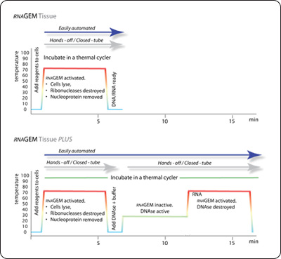 RNAGem™ tissue RNA extraction kits feature a new formulation of enzymatic technologies that uses a single-tube process to provide complete extraction of RNA. This includes smaller RNA molecules such as noncoding RNA and microRNA that may be excluded by other RNA extraction methods. The RNAGem kits deliver high molecular weight RNA and good transcriptome profiles. They are suitable for complete gene-expression and noncoding RNA analyses.